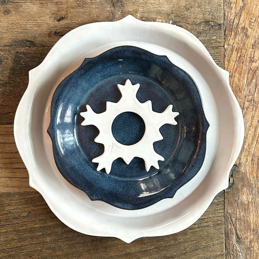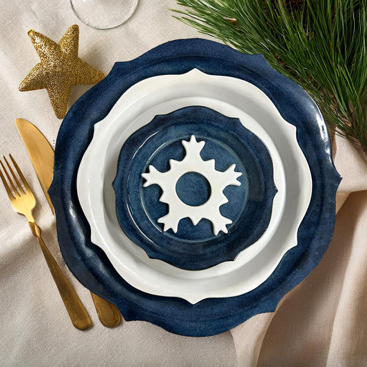 De här vackert lyxiga utformade tallrikarna blir guldkanten på nyårsdukningen. Den gräddvita mattallriken i kombination med den havsblå assietten och det tillhörande uppläggningsfatet kommer ta dina gäster med häpnad.