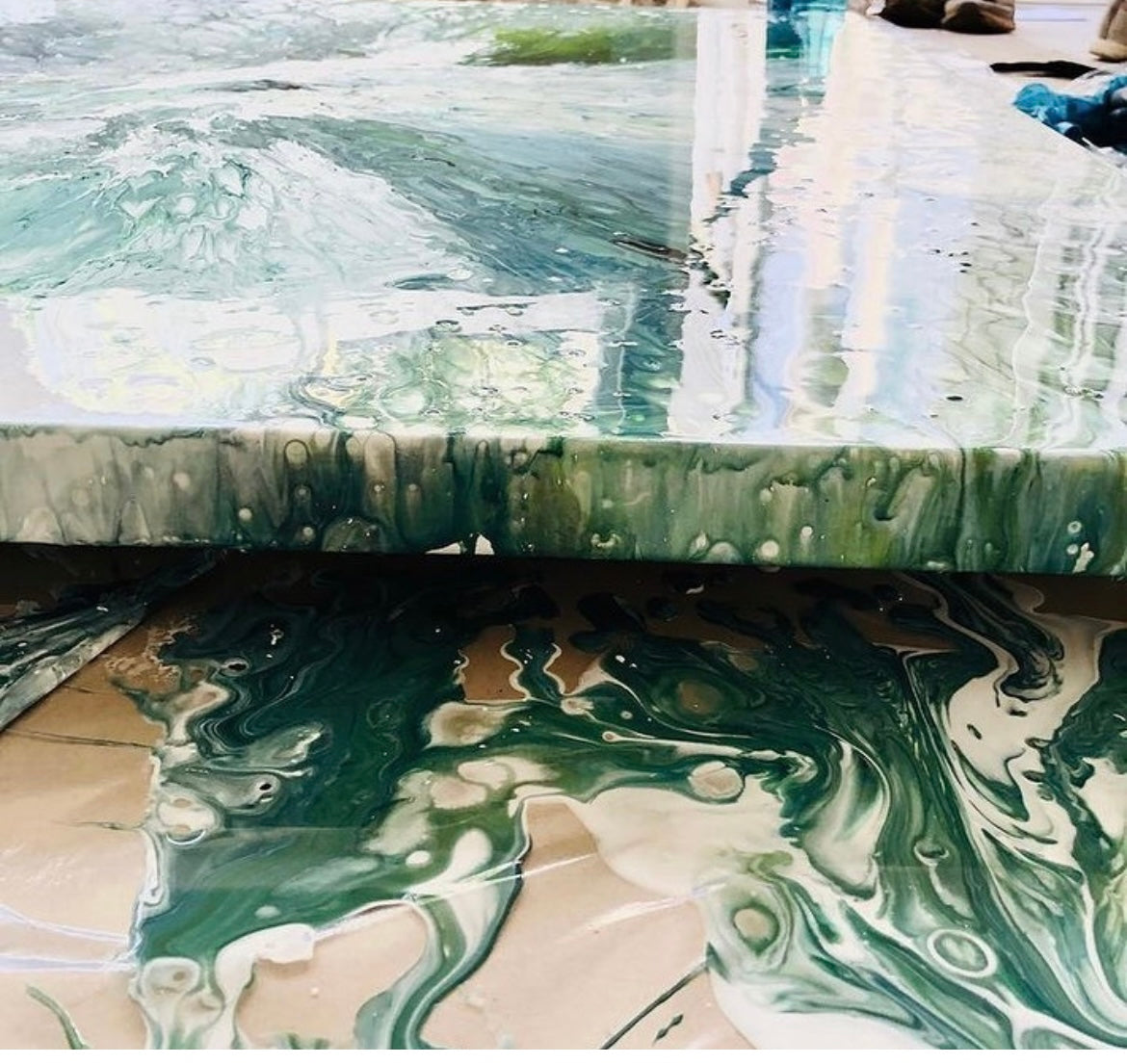 Vi skapar tavlor i så stor storlek att det krävs två personer för att tillverka dem. Färgerna smälter samman, bildar ytor och öar och varenda tavla är helt unik i färg och mönster.