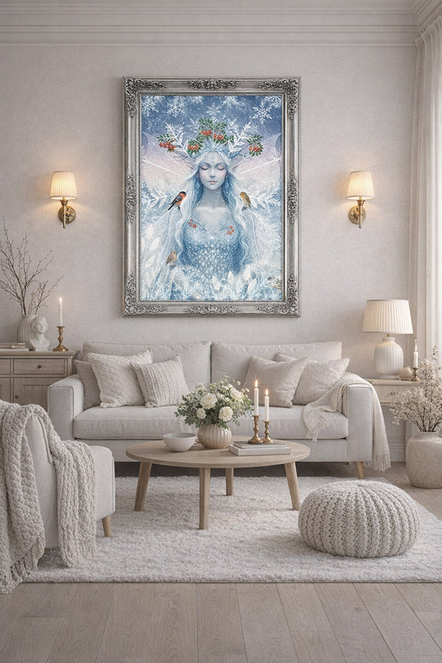 Isgudinnan passar fint ihop med Drakgudinnan och Tystvattengudinnan – motiv som tillsammans skapar en balans mellan styrka, stillhet och djup.