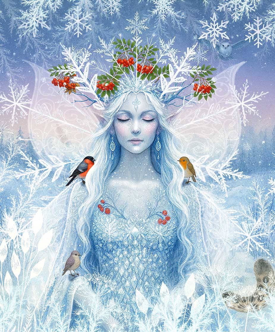 Isgudinnan rör sig i gränslandet mellan kyla och klarhet. Hon bär ett stilla lugn som inte är tomt, utan fyllt av närvaro och eftertanke. Ett motiv som påminner om pausen mellan andetagen, om tystnad som får bära och hålla.