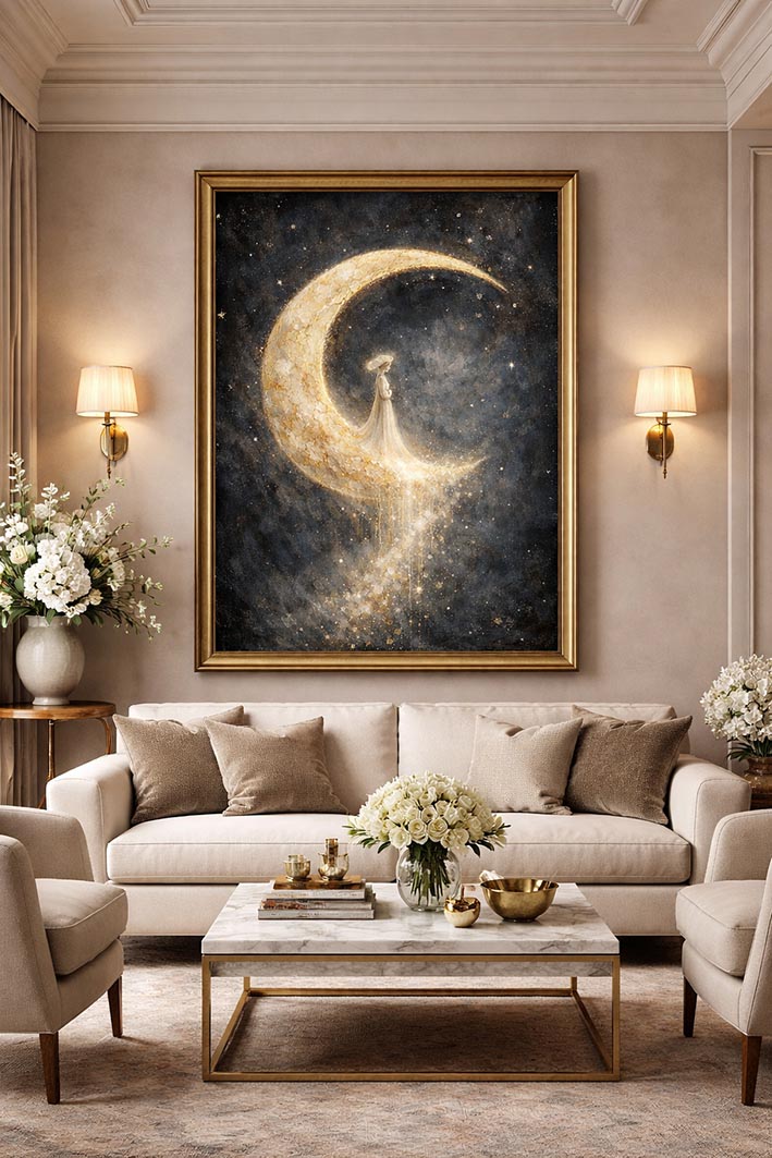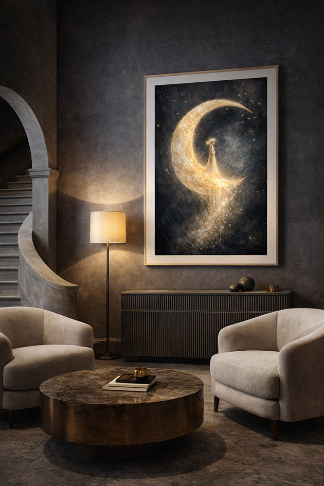 Hon står i månens gyllene båge – som i en tron av ljus – upphöjd över nattens djup. Här vakar hon inte som väktare, utan som härskarinna över det som föds i skuggornas rike. Månens ljus faller genom henne som ett arv. Tidlöst. Obrutet. Evigt återkommande.