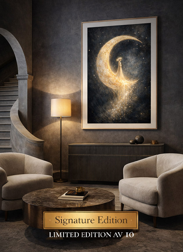 Varje exemplar trycks på arkivbeständigt fine art-papper och förädlas i ateljén med handmålade gulddetaljer. De gyllene partierna fångar ljuset och ger verket en levande lyster med subtila variationer i varje utgåva.